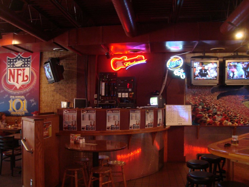 It’s been a couple of years since we’ve been and we noticed a few changes when we walked in. The familiar ring of televisions looped establishment but now we saw a couple of more projection screens hanging up. The familiar DJ booth/mega production area was fired up and humming. The Iowa memorabilia hanging on the walls reminded us whose territory we were in. The large wooden tables and stools is always a good setup for spectators that get tired of either sitting or standing, and it helped us while we surfed the web on the wireless connection.. We’d also be remiss to mention that the Overland Park location is the official alumni hangout for the Kansas City branch of the University of Northern Iowa.